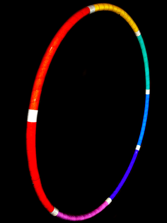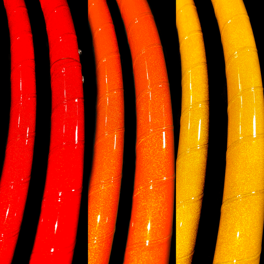 Our taped hoops are available in a variety of colors with multiple sizes and weight options, each one custom-made to your specifications. Decorative ("deco"), reflective, and beginner taped hoops are available!