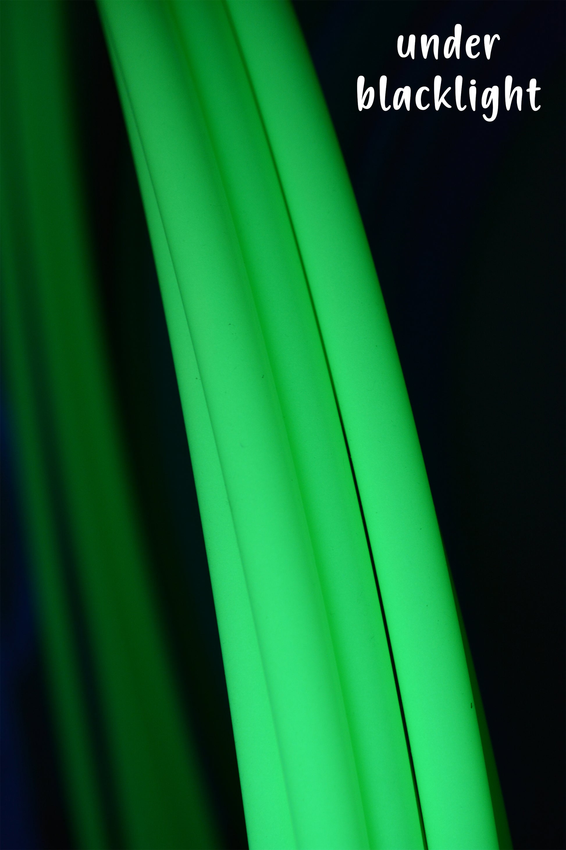 This tubing is photoluminescent which means that it glows in the dark. In daylight, the tubing is a pale light green color, in darkness, it glows green. The tubing must be "charged" by light in order to glow in the dark. The light source can be outdoor or indoor lighting OR black light.